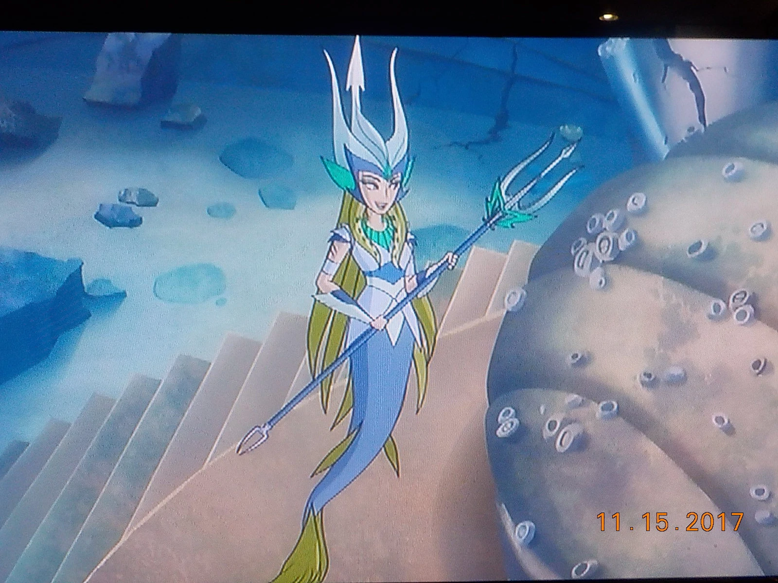 Silver Trident: From it she can emit powerful bolts of white electricity to electrify or stun her enemies. She can even create a silver-colored orbicular shield to protect herself and those around her. At one point, she bestowed upon the Mysticons and Proxima the ability to breathe water by granting them scaleless mermaid tails or octopus tentacles.